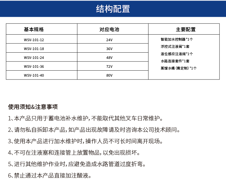 本產(chǎn)品只用于蓄電池補(bǔ)水維護(hù),不能取代其他叉車(chē)日常維護(hù)。