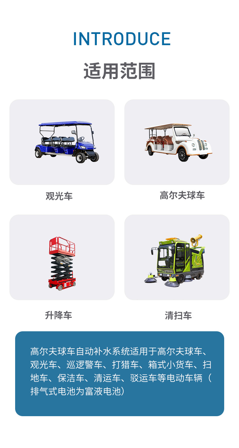 高爾夫球車自動(dòng)補(bǔ)水系統(tǒng)適用于高爾夫球車、觀光車、巡邏警車、打獵車、箱式小貨車、掃地車、保潔車、清運(yùn)車、駁運(yùn)車等電動(dòng)車輛 (排氣式電池為富液電池)