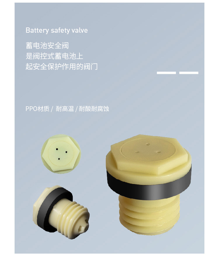 產(chǎn)品介紹蓄電池安全閥又稱蓄電池排氣閥,是閥控式蓄電池上起安全保護(hù)作用的閥門。在蓄電池工作時(shí)內(nèi)部反映放出氣體導(dǎo)致電池內(nèi)部壓力逐漸增加,當(dāng)壓力到達(dá)開閥閾值時(shí),安全閥自動(dòng)打開排出氣體,在電池內(nèi)部壓力下降至閉閥閾值后,安全閥自動(dòng)關(guān)閉,同時(shí)在此過程中可以防止外部氣體進(jìn)入電池和電池內(nèi)酸液濺出。可以避免電池內(nèi)壓力