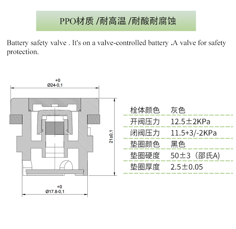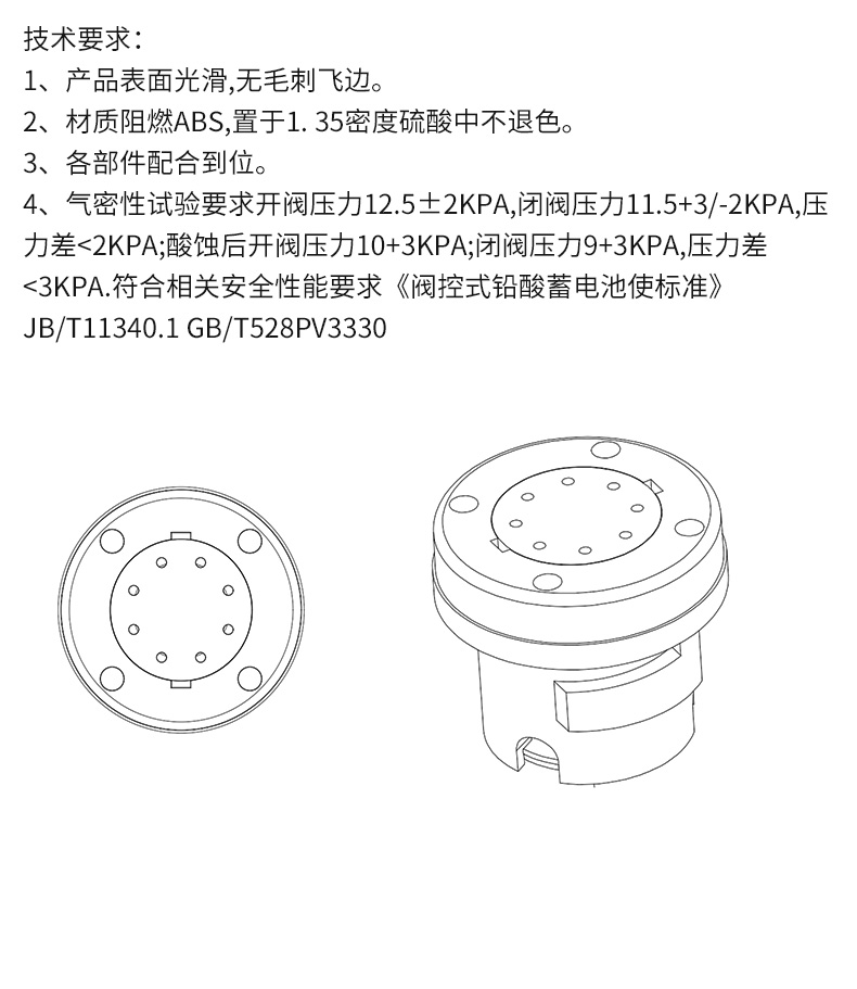 產(chǎn)品介紹蓄電池安全閥又稱蓄電池排氣閥,是閥控式蓄電池上起安全保護作用的閥門。在蓄電池工作時內(nèi)部反映放出氣體導(dǎo)致電池內(nèi)部壓力逐漸增加,當壓力到達開閥閾值時,安全閥自動打開排出氣體,在電池內(nèi)部壓力下降至閉閥閾值后,安全閥自動關(guān)閉,同時在此過程中可以防止外部氣體進入電池和電池內(nèi)酸液濺出??梢员苊怆姵貎?nèi)壓力